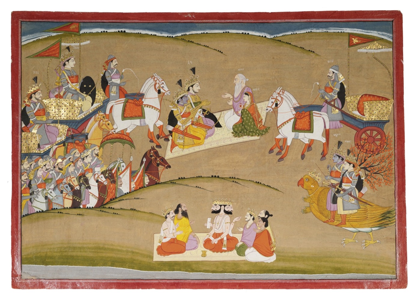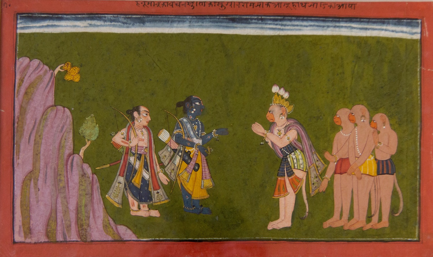 FOLIO FROM A RAMAYANA SERIES (SHANGRI III) SUGRIVA, WITH THREE OF HIS COUNSELORS, MEET RAMA AND LAXMANA