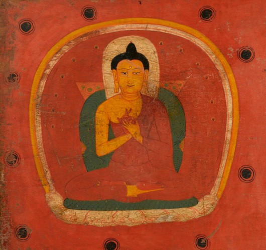 Three deities, each the center of a roundel, also adorned this face of the book cover, although two have been lost and only part of the central deity remains. The arm positions and remains of a sack suggest that this figure is Jambhala, the god of wealth. Also extant are a pair of eyes in the half-roundel at the far left, which suggest that kirtimukhas once graced these areas at either end of the central rectangle. Each element of the design is outlined by closely placed circles that represent a row of pearls, an ancient decorative device that dates back to at least Sassanian times (3rd – 7th century). The broad outer frame was originally filled with scrolling green foliage set against a red background, a stylistic element commonly found on covers in this style. The target-like concentric circles that float in a red background on both faces derive from symbols on Indian manuscripts that marked the end of chapters.
