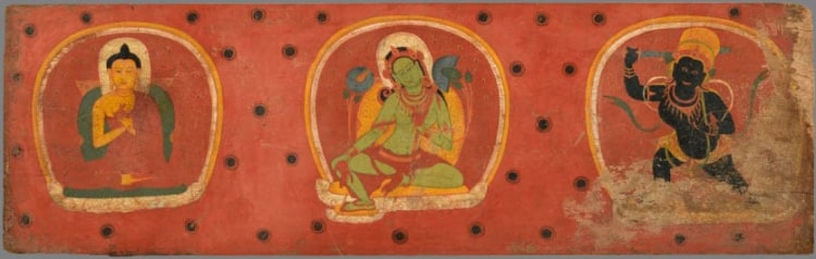 Depicted on the inside face of this book cover are three Buddhist deities, beautiful renditions of these gods that would only have been seen by the person reading the book. The central deity, the most important, is Green Tara, the compassionate savioress. She sits with her head cocked, as if listening for the pleas of the devoted, her hand extended with the palm up in the gesture of gift-bestowal. Her other hand holds her typical flower, a blue water lily with long petals, depicted here half-closed following the descriptions of Green Tara’s appearance found in Sanskrit texts. Another blue lily blooms beside her.